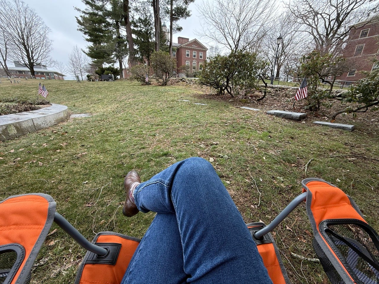 When we buried my aunt and uncle, we brought camping chairs so the older guests wouldn’t have to stand. It occurred to me that I could bring one anytime.
